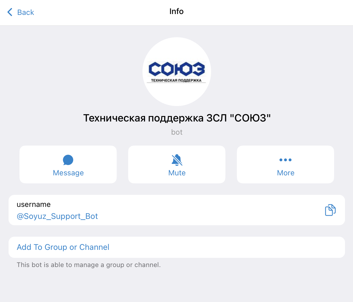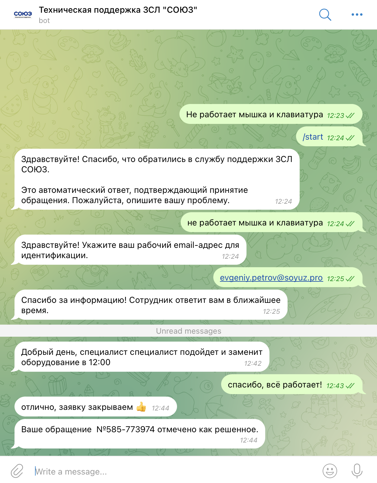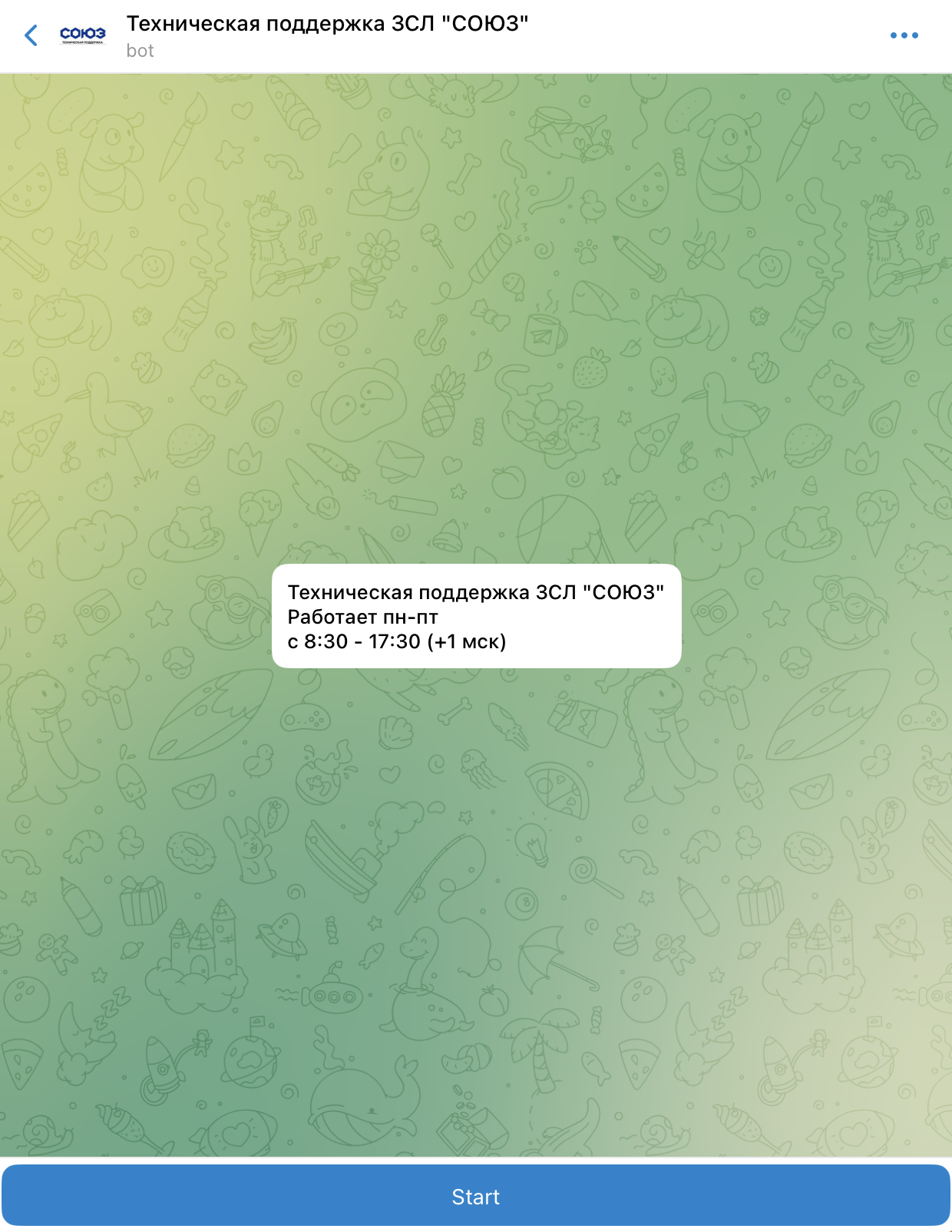 • Telegram бот по ссылке https://t.me/Soyuz_Support_Bot или поиском в телеграм по имени @Soyuz_Support_Bot