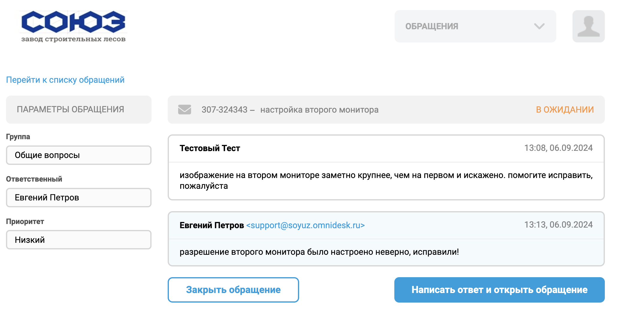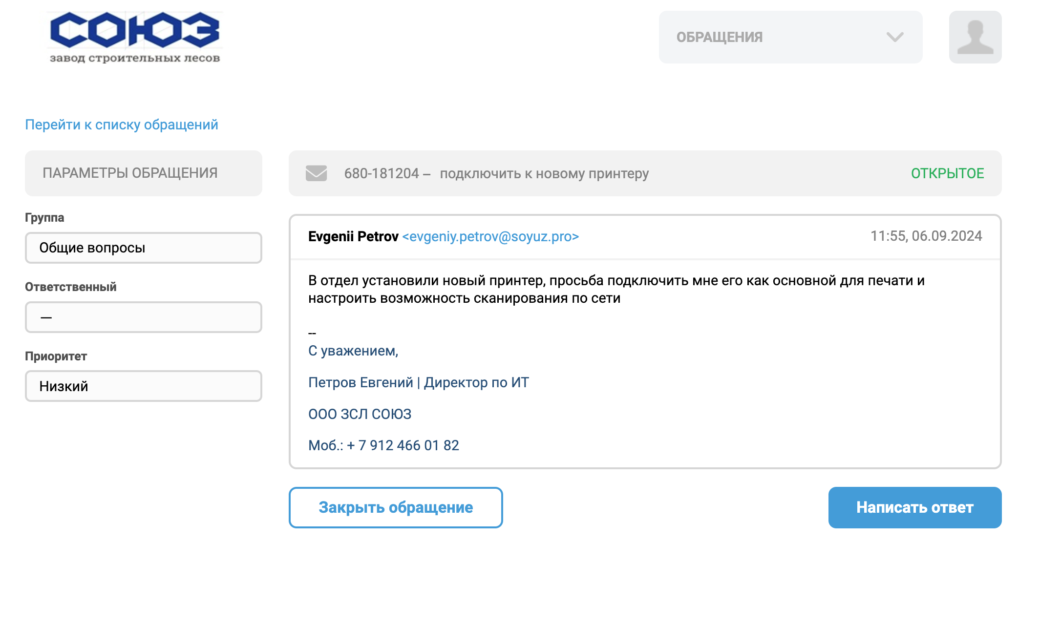 • Портал https://help.soyuz.pro где вы можете зарегистрироваться и видеть все свои текущие и закрытые обращения
